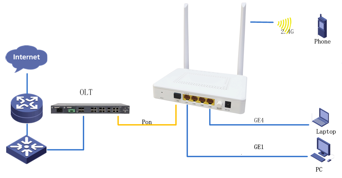 It configures one 10/100/1000Mbps port,three 10/100Mbps ports, WiFi (2.4G) port. Features         Compliance with IEEE 802.3ah(EPON) & ITU-T G.984.x(GPON) standard